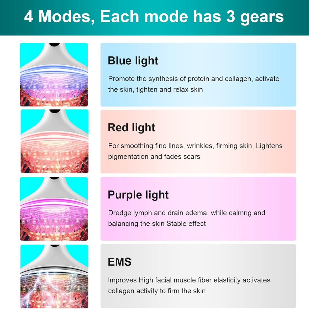Four Versatile Massage Modes: Tailor your treatment with specific settings designed for skin tightening, lymphatic drainage, neck lifting, and overall complexion brightening.