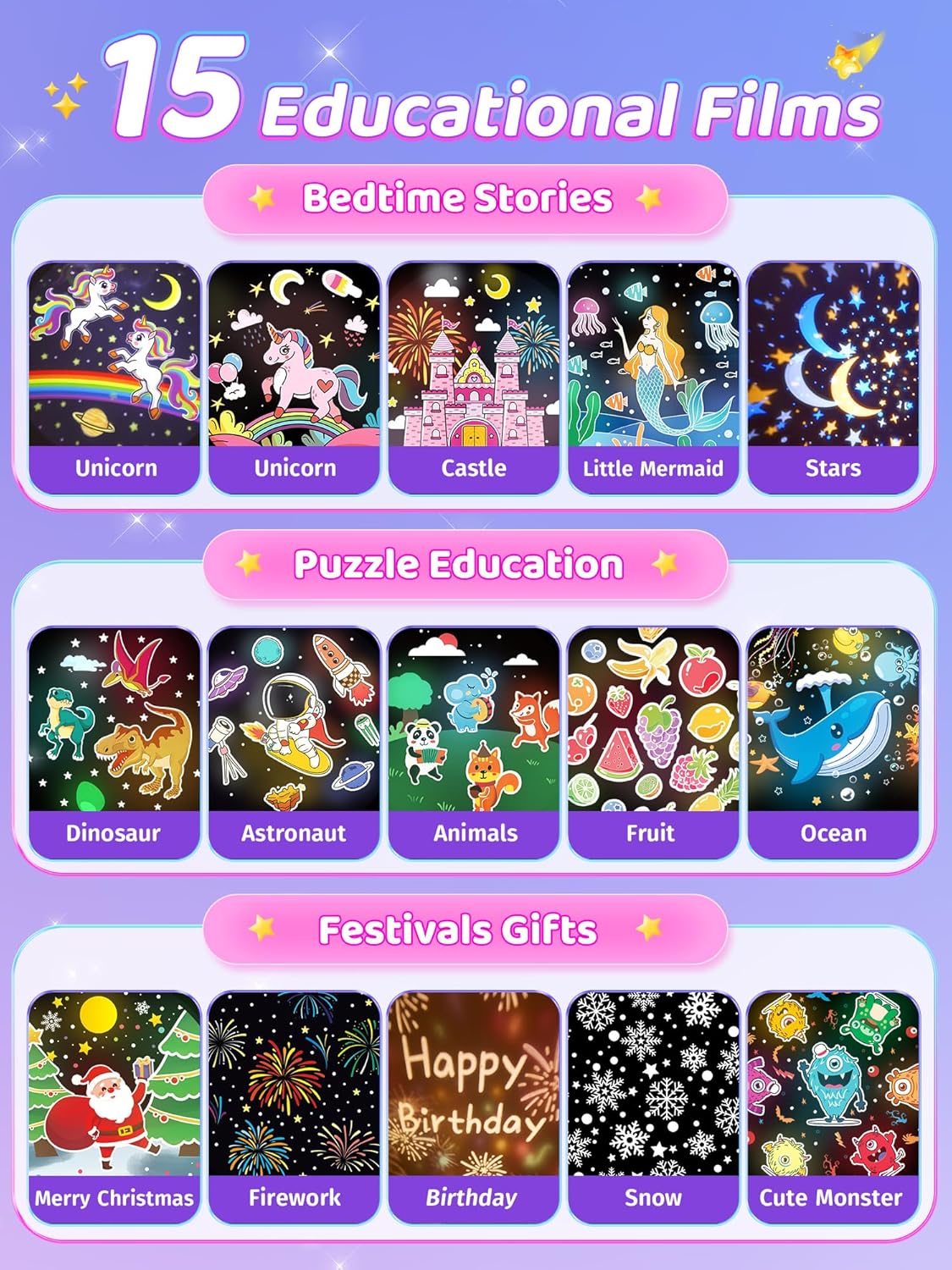 - 👸🏻15 FILMS STAR PROJECTOR FOR KIDS: The kids night light projector, princess toys has 3 THEMES & 15 FILMS: Bedtime Story, Puzzle Education, Festival Gifts: Star & Moon, Unicorn, Mermaid, Birthday, Castle, Ocean... Kids night light projector for kids room is clear enough to point out all the animals on the wall. Projector night light for kids night light & princess toys are clear and glow in the dark, creating a bright world that stimulates kids' imagination & helps them fall asleep. Girls can change the star projector for kids night light, princess toys, princess night light projector &star lights for ceiling to their fav film, and have a different bedtime experience to enjoy sweet dreams~